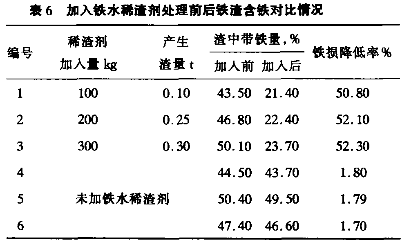 为证实加入铁水稀渣剂后能否达到渣铁分离,减少渣中的带铁量,我们在铁水进站处理前取铁渣样,加入稀渣剂处理后再取同一炉次处理后的铁渣样进行对比分析,其结果见表6。