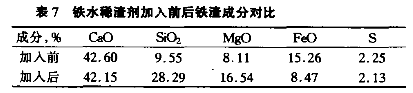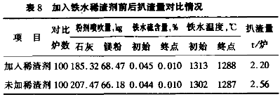 (1)铁水稀渣剂的使用,改变预处理后铁渣的流动性,使扒渣操作较易进行,扒渣量明显减少。